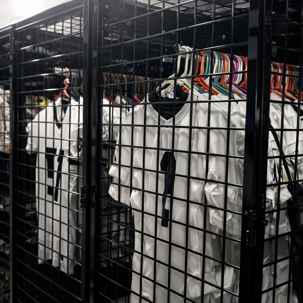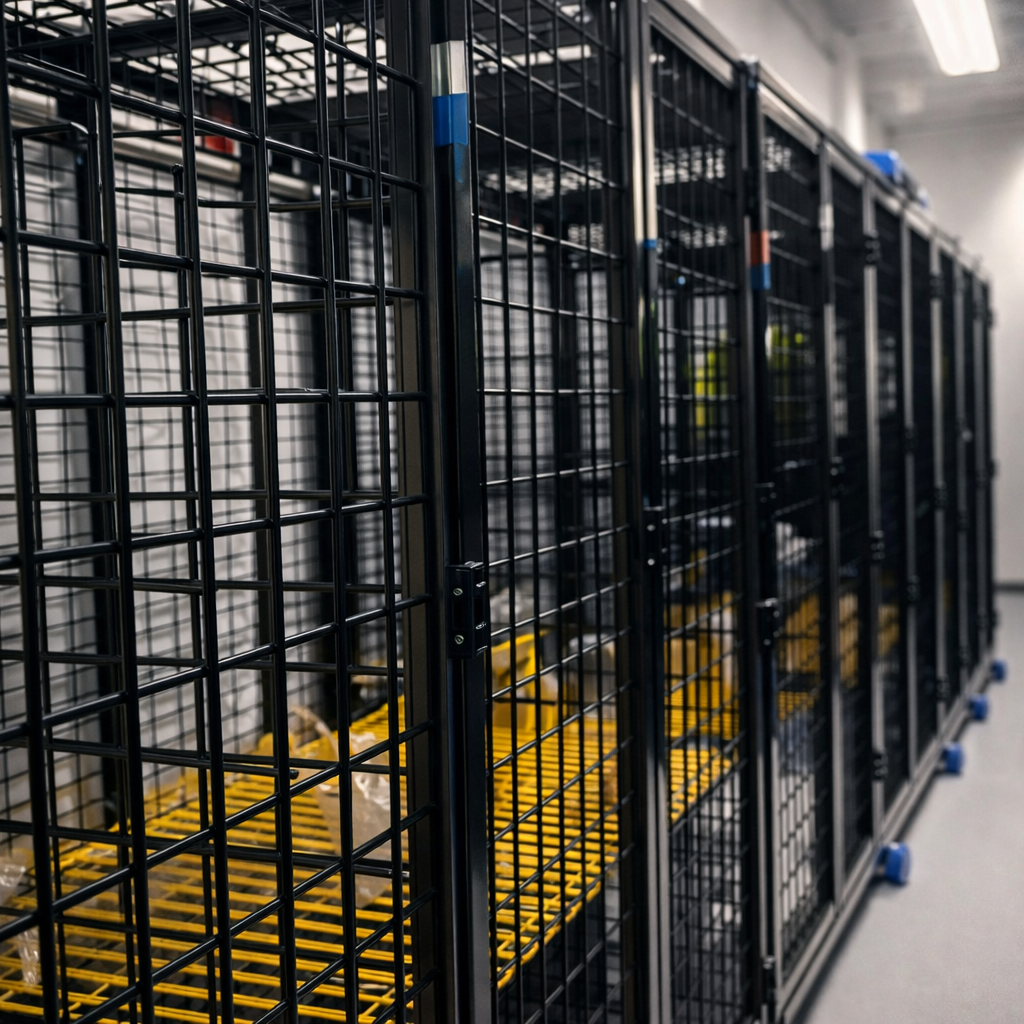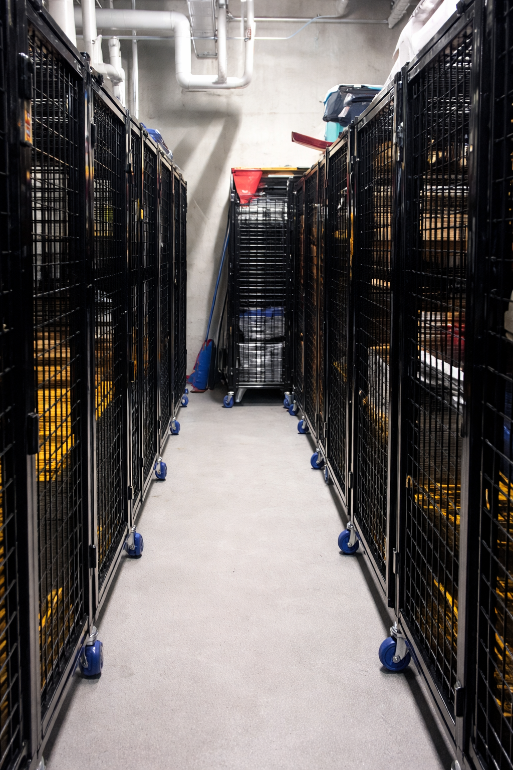 Each sports team received the same core type of athletic storage cage, creating consistency throughout the facility, while still allowing for customization based on each sport’s needs. Some cages include hanging bars or shelves, while others are completely open, ensuring every team has the right setup for their equipment.